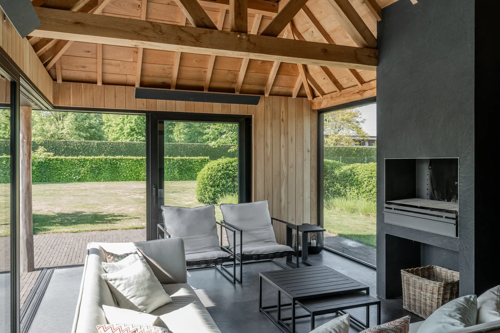 Zwart gebeitste poolhouse met bar en houthaard. Deze zwart gebeitste poolhouse vormt een stijlvol buitenverblijf met een warme, gezellige sfeer. De geïntegreerde bar en de traditionele houthaard maken van deze ruimte een perfecte plek om gasten te ontvangen of heerlijk tot rust te komen. De combinatie van natuurlijke materialen en een strakke afwerking zorgt voor een tijdloos resultaat.