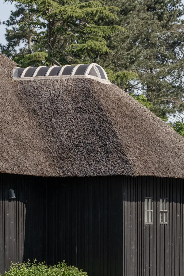 Landelijke poolhouse met rietdak